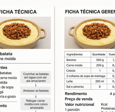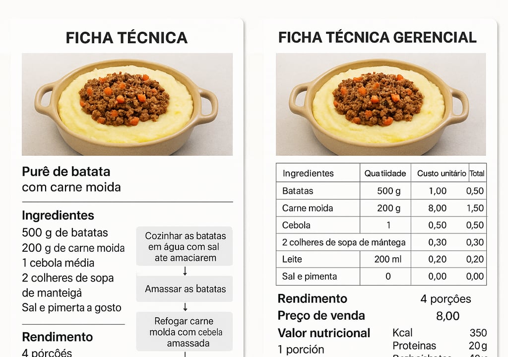 Exemplo prático: o cozinheiro usa a ficha operacional para saber o peso exato das batatas, o tempo de cocção e o ponto de sal do purê de batata com carne moída.