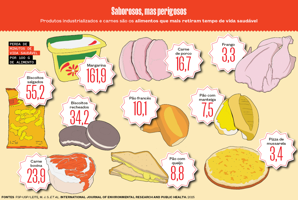 Esse estudo propõe que, além do preço, das calorias e da proporção de gorduras, proteínas e açúcar, é preciso pensar nos eventuais danos dos alimentos ao ambiente. Aplicando o índice HENI à alimentação brasileira, a equipe da USP calculou o impacto de uma determinada quantidade de diferentes alimentos no tempo de vida saudável. O biscoito salgado, por causa do excesso de gordura trans e cloreto de sódio, é o alimento mais prejudicial da lista: porções de 100 gramas (g) podem subtrair 55,2 minutos (min) por dia de vida saudável se o consumo for contínuo ao longo de cinco anos. No outro extremo, a mesma quantidade de peixe de água doce poderia acrescentar 9,1 min por dia.
