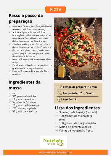 A pizza caseira com queijo e especiarias é uma preparação que une praticidade, sabor e valor nutricional, permitindo o uso de ingredientes frescos e selecionados. Sua elaboração artesanal possibilita o controle da qualidade dos alimentos utilizados, além de promover uma alimentação mais equilibrada em comparação às versões industrializadas. O queijo fornece proteínas de alto valor biológico e cálcio, essenciais para a manutenção da saúde óssea, enquanto as especiarias, como orégano, manjericão e pimenta-do-reino, contribuem para o aroma, o sabor e a presença de compostos bioativos com propriedades antioxidantes e anti-inflamatórias. Essa receita, além de representar uma alternativa saudável e saborosa, estimula o preparo culinário consciente e o resgate da alimentação tradicional no ambiente doméstico.
