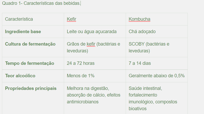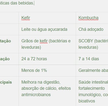 A diferença entre kefir e kombucha está relacionada aos ingredientes, processos de fermentação e perfis microbiológicos. Ambas são bebidas fermentadas com propriedades probióticas, mas apresentam características distintas.